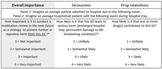 “Overall importance” was the pre-specified key criterion that was used to prioritise the ADEs. Since we considered “overall importance” an insufficiently specific concept to be uniformly understood by the panellists, we asked them to rate for each ADE the importance to “conduct a medication review (in the near future) as a strategy to prevent further or repeated harm” in relation to an average patient (