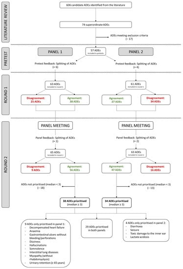 In this study, we identified a total of 38/65 (58%) ADEs at hospital admission and 34/63 (54%) ADEs during hospital stay, for which there was consensus on their high overall importance, thus classified as “prioritised”. While the majority of prioritised ADEs after round 2 were common to both panels (n = 29), a total of 13 ADEs were selected only by one panel (nine ADEs only by panel 1 and four ADEs only by panel 2), which supports our approach of separate setting-specific consensus processes.