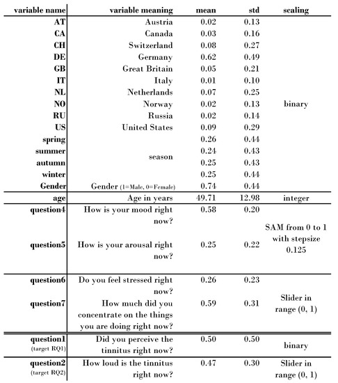 - RQ1: Can momentary tinnitus (Question 1 of the daily EMA questionnaire; yes/no answer options) of TYT users be predicted (binary classifier trained) based on the following features: country, season, age, and sex from the baseline questionnaires as well as the following items of the daily EMA questionnaire: mood, arousal, stress, concentration, and the worst symptom perception. Note that, except for the prediction targets, the features used have been used in other analyses and have proven prediction power on this data set. To be more precise, we excluded features of TYT that are highly correlated with the target, such as tinnitus loudness, tinnitus stress, and momentary tinnitus. However, we included features that are known to be correlated with tinnitus, such as sex and age [16].