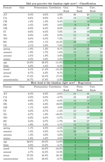 In order to find out which of the variables had a high impact on tinnitus prediction, we looked at the feature importance of the Gradient Boosting Machine. In order to determine the feature importance more accurately, we investigated three methods. The first is called the Gini importance, the second the permutation importance, and the last the correlation. These three methods measure the feature importance in different units, which makes it impossible to compare importance between methods. However, in order to make the results comparable we created an importance ranking. The lower (i.e., greener) the ranking number is, the more important the feature is for the model to predict the target. Figure 2 shows the features with their importances for the models. We calculated the feature importance for each model (classifier and regressor) separately. In order to classify the momentary tinnitus, demographic features are most important, with an average rank of 4.5. To regress the tinnitus loudness, the daily questions are most important with an average rank of 4.16). For both models, age is the most important feature (average rank = 2), as it has a high cardinality. Conversely, country has a lower importance (average rank = 13.6), as it has only a low cardinality with low variance. For each model, the Gini importance values within one column add up to 100%, while the permutation importance indicates the absolute increase of the error rate if that feature was left out. As the percentages cannot be compared between columns, only within a column, the ranks of the feature importances are provided. As age is a feature with high cardinality, it clearly helps the tree-based Gradient Boosting Machines to predict the targets. The high feature importance for the age variable could be an indication of overfitting of users with many assessments. The permutation importance of 29.7% suggests that the performance becomes 29.7% percentage points worse when age is replaced by a random variable. For example, almost all Russian users consistently answered the question about current tinnitus in the affirmative. Within the countries feature, Russia therefore has a high correlation with current tinnitus. However, because there are relatively few users compared to all users, the Gini importance for Russia only shows a value of 2.19%.