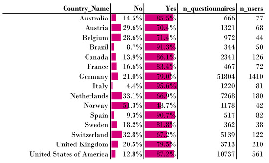 To answer this question, we used 97,742 responses from 3691 users from a total of 111 countries for the period April 2014 to February 2021. For further analysis, we restricted ourselves to the countries represented by at least 30 users and with more than 300 questionnaires in total. For this subset of 15 countries there were 3163 remaining users with a total of 88,049 filled out daily questionnaires. The most responses were from Germany, with 51,804 completed questionnaires (58.84%) generated by 1410 users (38.20%), whereas the fewest completed questionnaires came from the Federative Republic of Brazil, with 334 completed questionnaires (0.38%) generated by 50 users (1.35%). The mean number of filled-out questionnaires per country was 5870 (std = 13,058). The mean number of users was 210 (std = 357). For the question of interest, Did you perceive the tinnitus right now? (question1), the mean value for ’Yes’ was 78.97% (std = 12.21%), an interquartile range of 15.73%, with a maximum value of 95.58% from Italy and a minimum value of 48.66% from Norway.