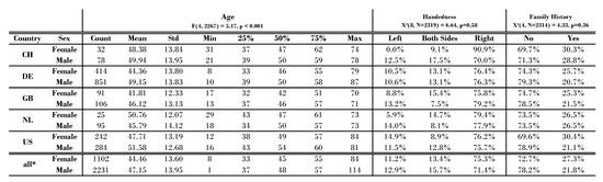 In order to ensure comparability between the countries under consideration, we examine the demographic variables in detail in Figure 5. Additionally, the data are grouped by gender. The for handedness and family history is n.s. For the age distributions, the post hoc Tukey test shows significant mean differences for DE and the US (p< 0.05) and for GB and the US (p< 0.01). The figure supports the comparability of the five countries that are mainly discussed in RQ3.