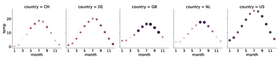 In a slightly different approach, we considered months instead of seasons. In addition, we examined the respective average temperature per month in relation to tinnitus occurrence for the countries considered (i.e., Switzerland, Germany, U.S., Great Britain, and the Netherlands). In this context, a positive correlation means that the higher the temperature, the more likely there is to be momentary tinnitus. A high positive correlation was obtained for the Netherlands (r(10) = 0.83, p < 0.001), Great Britain (r(10 = 0.86, p < 0.001), and Switzerland (r(10) = 0.72, p = 0.009). For Germany and the U.S., however, the correlation between temperature and tinnitus occurrence can be considered uncorrelated (both p-values > 0.1). The cyclical temperature pattern associated with tinnitus over the year for the various countries is shown in Figure 6. The larger the circle is, the higher the average probability of momentary tinnitus for this country in this month is. The size and color of the cycles indicate the chance of momentary tinnitus. There was a statistically significant difference between the countries as determined by one-way ANOVA (F(4, 55)= 6.69, p< 0.001). A post hoc Tukey’s test indicated that the annual course of momentary tinnitus is different between the country pairs Netherlands–U.S. (p< 0.01) and Switzerland–U.S. (p< 0.01).
