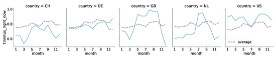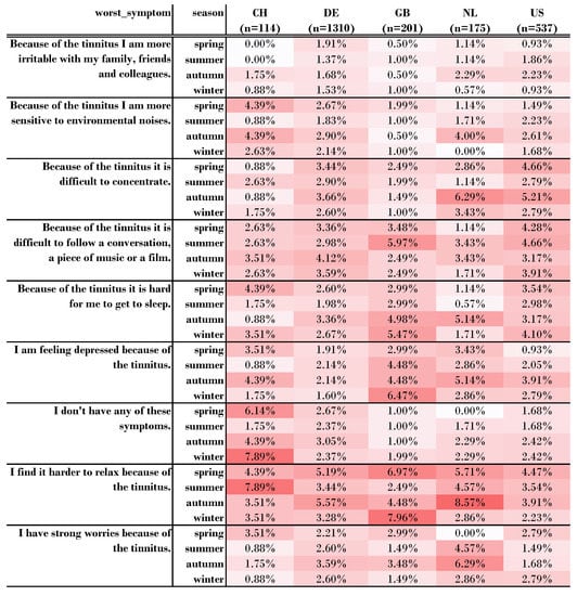 Three additional notes are important regarding RQ–RQ. First, the last sub-question was set up with the involvement of medical experts, as severe symptoms play an important role in the context of tinnitus research. As TYT asks about nine possible worst symptoms, we investigated how the worst symptom differs across countries and seasons. As the combined perspective taken for RQ was useful, this combined perspective was accomplished for RQ. Second, in the context of season-specific differences, we added an additional dimension, the temperature course throughout the year, inspired by the results of [8].