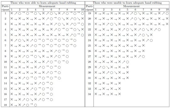 Measurement time series of individual HCWs performed with 1.5 mL ABHR, represented with a Markov model. Symbols ○ and × stand for adequate and inadequate coverage, respectively. Arrows highlight the changes between the outcomes of consecutive measurements.