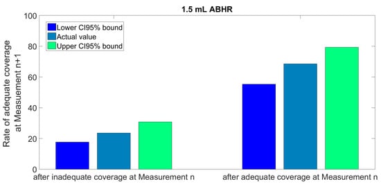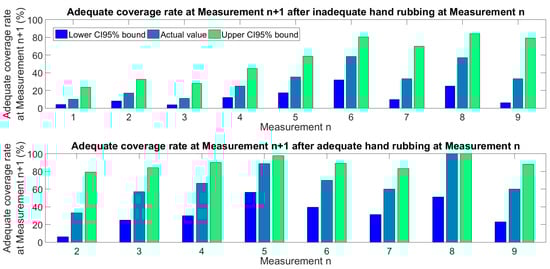 Statistics of consecutive measurements using 1.5 mL ABHR. The upper graph shows the adequate coverage rate at Measurement n + 1, occurring after inadequate coverage performed at Measurement n. The lower graph shows the adequate coverage rate at Measurement n + 1, occurring after adequate coverage performed at Measurement n.