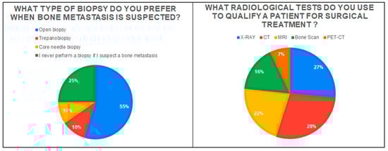A biopsy in the case of suspected bone metastases is indicated primarily in tumors of unclear origin (differentiation from bone sarcomas and benign, locally aggressive lesions) [31]. Moreover, in our study, 69% of the respondents believe that in the case of a single bone lesion, even in patients with a history of oncology, a biopsy is indicated. The choice of the biopsy method depends on the orthopedic center and the experience of the surgeons; however, the most frequently chosen methods in the case of bone tumors are surgical (open) biopsy and core-needle biopsy [32]. More than half of the respondents in our study (55%) prefer a surgical biopsy, while approximately 20% would choose a core-needle biopsy or a trepanobiopsy. Among radiological tests, the first choice for bone tumors is X-ray (assessment of the lesion—osteosclerotic\osteolytic) [8]. Although MRI, bone scan, and PET-CT are useful tests to obtain more accurate imaging of lesions in the bone and for differential diagnosis, they are not always available to orthopedic surgeons [33]. This is confirmed by our study, where X-ray was chosen by 86% of respondents, MRI by 70%, bone scan by 52%, and PET-CT by 23%. This is also evidenced by the high percentage of computed tomography (CT) performed in the case of suspected MBD—91% of respondents. In the case of small orthopedic centers, in the absence of tests such as MRI or bone scans, surgeons may more often decide to examine patients with MBD using a CT. Although CT allows for the determination of bone tissue destruction and allows the assessment of the risk of fracture, only MRI allows for a more accurate analysis of the soft tissue infiltration by the tumor and a better estimation of the biopsy site [19,33].