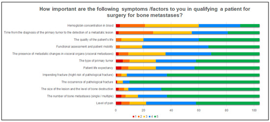 The second part focuses on aspects of the diagnosis of bone metastases and the qualification of patients for surgical treatment (management of a patient with suspected MBD, diagnostic imaging, biopsy, scales used to qualify patients). In addition to the suggested answers, the participants had the opportunity to add their own. Questions 13–24 were based on the Likert scale, in which the respondents could choose the importance of a symptom/factor while qualifying a patient for surgery (1, completely unimportant; 2, slightly unimportant; 3, slightly important; 4, moderately important; 5, highly important). The factors most frequently mentioned in the literature as important in qualifying patients with MBD for surgery were selected [5,8,11].