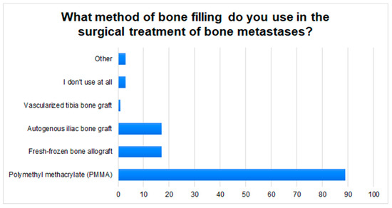 In the cases of well-vascularized bone metastases, the surgeons’ responses were almost evenly distributed: 38.5% of the respondents did not use preoperative embolization at all or rarely; 21.2% use it only sometimes, while 30.4% use it always or often. After surgery, the respondents most often refer patients to an oncology clinic (85.6%) or an orthopedic clinic (14.4%). In clinical practice, the respondents most often use Polymethyl methacrylate (PMMA) (85.6%) to fill in bone loss after resection of a metastatic lesion. Other methods are shown in Figure 3.