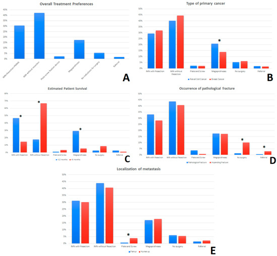 The survey responses in the “Clinical cases” section were combined with the frequency of selecting the surgery method of treatment and recorded as percentages (A). The percentages of the breakdown of overall responses by—type of primary cancer (B), estimated time of survival (C), occurrence of pathological fracture (D) and anatomical localization of metastases (femur/humerus) (E) are shown. * An asterisk indicates a statistically significant difference (p < 0.05) for the comparisons between groups (Mann-Whitney U test). Abbreviation: IMN—Intramedullary nail; PMMA—Polymethyl methacrylate.