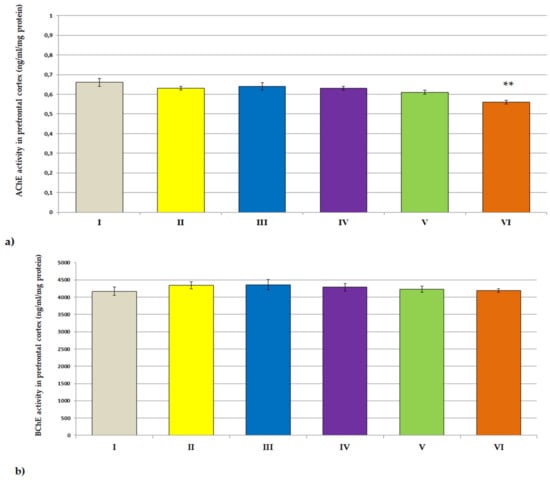 The influence of extracts on the ACHE (a) activity, BCHE activity (b), IL-1β concentrations (c) and IL-6 concentrations (d) in the prefrontal cortex of rats. All values are reported as mean ± SEM (n = 7). Significance: * p < 0.05, ** p < 0.01 vs. control group (one-way ANOVA followed by Tukey’s post hoc test). I—aqua pro injectione; II—Narcissus triandrus L. 20 mg/kg; III—Lycopodium clavatum L. 10 mg/kg; IV—Lycopodium annotinum L. 10 mg/kg; V—Huperzia selago L. 10 mg/kg; VI—Angelica dahurica (sp.) 200 mg/kg.