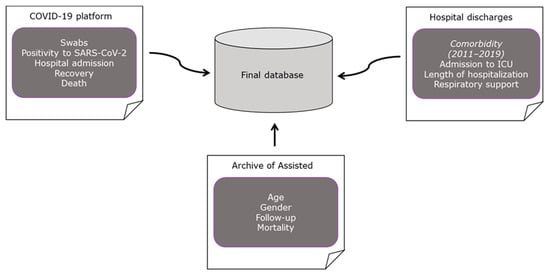 To assess the characteristics of patients affected by COVID-19 for the first time during the three COVID-19 pandemic waves, data were obtained through record-linkage of regional health administrative data, as explained in Figure 2.