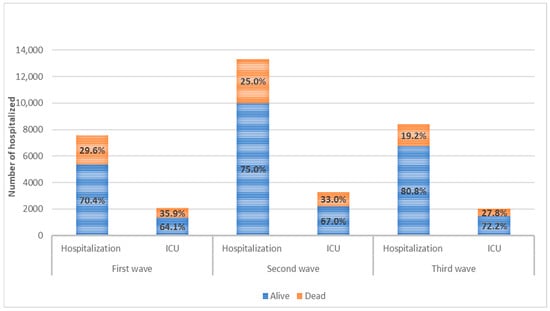 Differences among the three waves were less evident, both in absolute numbers and in percentages, considering patients hospitalized in ICU (Table 3 and Table S2). However, it is interesting to notice that in the third wave, a reduction in deaths was recorded both in the ICU and in the other wards.