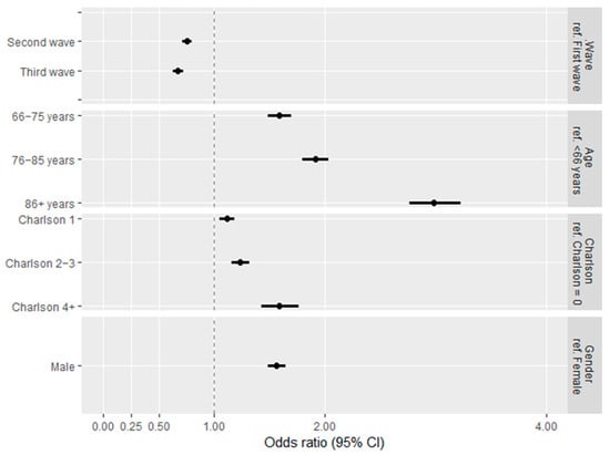 As expected, the patients who died were significantly older and with more comorbidities in all three waves (Table 5 and Tables S3–S5). Considering the confounding by age, gender, and comorbidity, patients in the second and third waves showed a reduction in severe outcomes (ICU hospitalization or death) compared with patients in the first wave (OR: 0.75, 95% CI: 0.71–0.79; OR: 0.67, 95% CI: 0.63–0.72, respectively) (Figure 4).