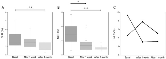 Neutrophil to lymphocyte ratio (NLR) in mild ((A); n = 7), moderate ((B); n = 15) and severe ((C); n = 2) COVID-19 patients at hospital admission (basal), after one week and after one month of hospitalization. * p < 0.01; *** p < 0.0001; n.s.: not significant.