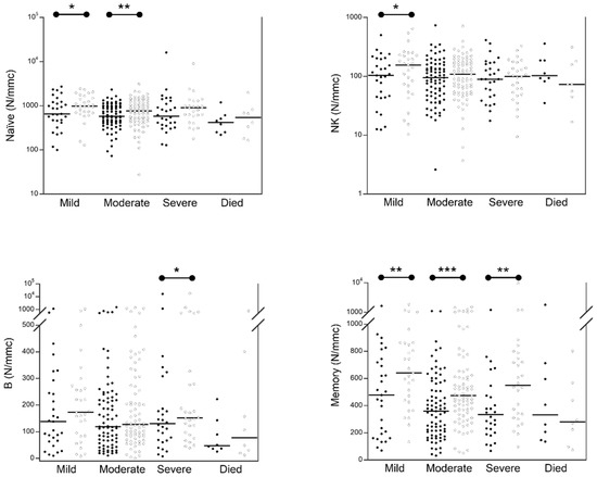Comparison of circulating lymphocyte subpopulations in 144 COVID-19 patients with different severity at hospital admission (black circle) and after 1 week (white circle). The black lines represent the median values. * p < 0.05; ** p < 0.005; *** p < 0.0005.
