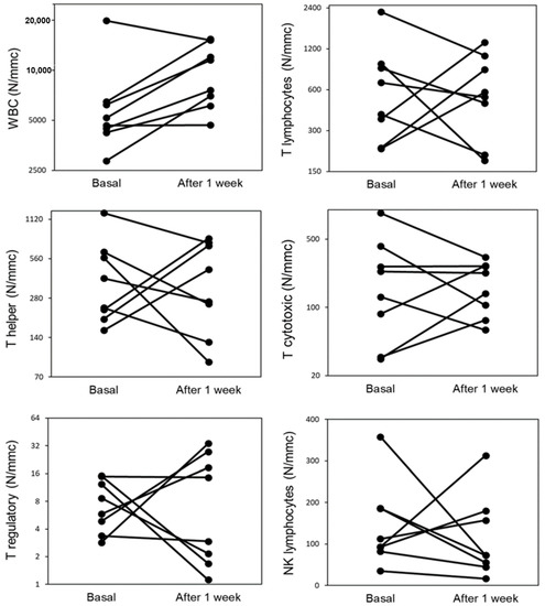 Figure 4 shows that in 6/8 patients the number of total leukocytes was increased after one week of hospitalization while, in 5/8 the number of T lymphocytes, T helper, T cytotoxic, T regulatory, and NK lymphocytes, showed a trend of reduction after one week of hospitalization. In all the 8 patients the number of total activated and TH1 activated lymphocytes was increased after one week of hospitalization (data not shown).