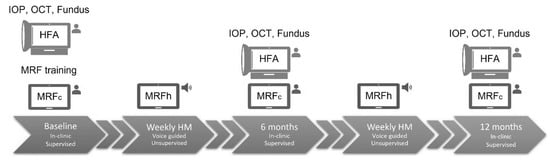 Experiment timeline. In-clinic visits were conducted at baseline, 6 months and 12 months with weekly home monitoring in between. HFA = Humphrey Field Analyzer; MRFc = Melbourne Rapid Fields performed under clinical supervision; MRFh = Melbourne Rapid Fields performed at home under voice guidance; IOP = intraocular pressure; OCT = optical coherence tomography.