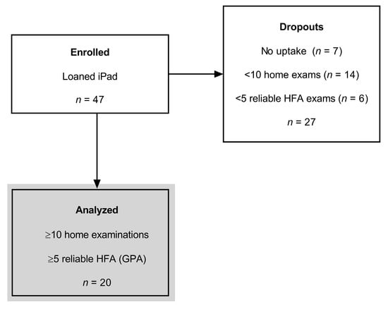 Furthermore, calculation of the HFA GPA requires a minimum of 5 reliable HFA examinations, and this was not achieved in n = 6 individuals (Figure 2, no GPA, <5 reliable HFA examinations). Our analysed group, reported from here onwards, was composed of n = 20 participants that progressed passed the ‘learning phase’ and delivered five reliable HFA examinations in-clinic (Figure 2, analysed, grey shaded area).