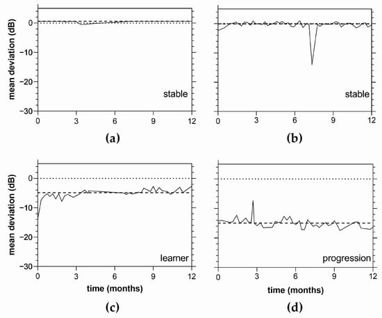 Example mean deviation (MD) trends over 12 months of visual field telemedicine for 4 participants: (a) stable data with no learning or fluctuation events; (b) stable with a single fluctuation event; (c) learning effect with fluctuation; (d) one case of progression on the MRFh (Progressor 1, Figure 9). The dashed lines indicate the median of all data points. Although the progression involves only a small change (approximately 2 dB), note how the data consistently falls under the median line towards the end of the monitoring period (right side of (d)).