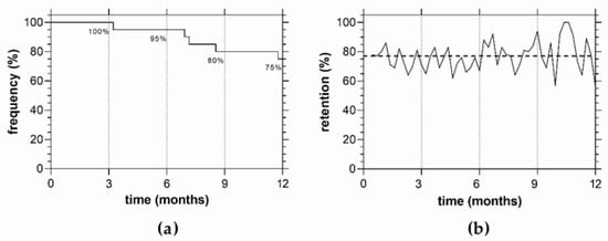 Time to dropout and compliance to weekly testing in n = 20 eyes that undertook visual field telemedicine with MRFh: (a) time to dropout over 12 months of visual field telemedicine with MRFh; (b) compliance to the request for weekly testing (7 + 1 days) returned by active participants over this period. Note the number of active participants decreased to 75% (n = 15 of 20) as shown in (a).
