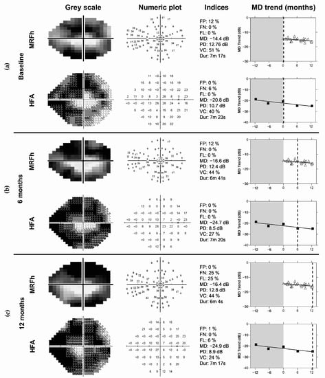 Typical outcome returned after 12 months of the VFTM by a 58 year old with glaucoma progression identified by clinical methods. The MRFh and HFA results are shown at (a) baseline, (b) 6 months and (c) 12 months. Right panels show the mean deviation trend (MD, dB) over 12 months for MRFh (filled triangles) and HFA (filled squares). x-Axis labels indicate months. The grey shaded area of the MD trend represents the period prior to VFTM where 2 reliable HFA fields were obtained as a baseline for GPA analysis (5 reliable results in total). The dotted line indicates the timepoint for a representative VFTM result. FP: False positive rate; FN: false negative rate; FL: fixation loss; MD: mean deviation; PD: pattern deviation; VFI: visual field index; VC: visual capacity; Dur: test duration.