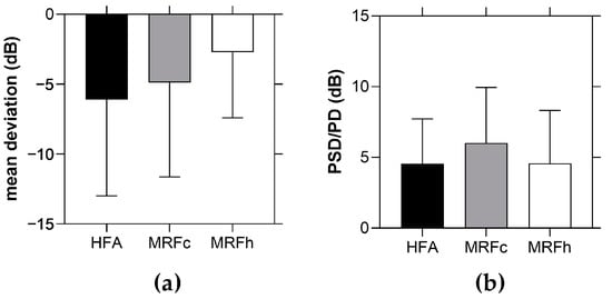 Supervised (HFA, MRFc) versus unsupervised (MRFh) visual field testing: (a) average mean deviation for n = 20 participants with glaucoma; (b) average pattern standard deviation (HFA)/pattern deviation (MRF) from n = 20 participants with glaucoma. HFA: Humphrey Field Analyzer; MRFc: MRF performed under supervision by a clinical assistant in-clinic; MRFh: MRF performed under app generated voice prompts from home; PSD: pattern standard deviation (HFA); PD: pattern deviation (MRFc and MRFh).