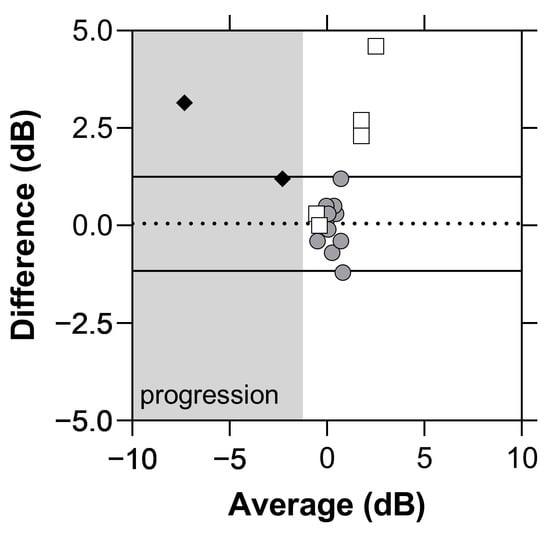 Bland–Altman plot of the HFA guided progression analysis (GPA, MD slope, dB/yr) and MRFh MD trend in glaucoma participants with no progression (filled circles, n = 18). Progressors (grey shaded area, black diamonds, n = 2) were not included in the Bland–Altman analysis. The unfilled square symbols identify 5 cases who showed significant learning effects (change or fluctuation > 3.7 dB over the 12 month period). Some of these cases returned ‘improved’ thresholds at later times, which produce an artefactual improvement in their outcomes. Average difference: 0.05 dB/yr. 95% Limits of agreement: −1.1 to 1.2 dB/yr.