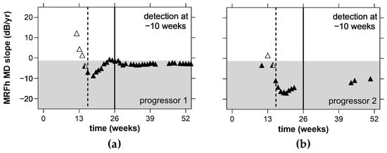 Detecting change in two cases with progression identified by the reviewing clinician. The MRFh MD slope was calculated over a minimum of ≥5 reliable tests. Unfilled triangles represent non-progressing slopes (>−1.25 dB/yr) and semi-filled triangles represent unconfirmed change (single point ≤−1.25 dB/yr). Filled triangles are slopes that indicate confirmed change (second consecutive result ≤−1.25 dB/yr, grey shaded area). Dashed lines indicate confirmed progression at retest. Solid lines indicate next clinical review. Average MD trends for (a) progressor 1: MRFh = −2.4 dB/yr, HFA GPA = −2.2 dB/yr; (b) progressor 2: MRFh = −10.2 dB/yr, HFA GPA = −1.3 dB/yr).