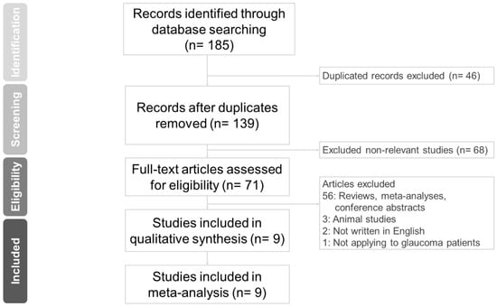 Figure 1 shows the PRISMA flow diagram of study screening. An initial search yielded 185 citations. After eliminating duplicated records (n = 46), 139 studies remained. Then, we excluded non-relevant studies (n = 68). Studies categorized as reviews, meta-analyses, and conference abstracts were also excluded (n = 56). We further excluded three animal studies, two papers not written in English, and one study in which LBN 0.024% was not used in glaucoma patients. Finally, nine studies were included in our meta-analysis.