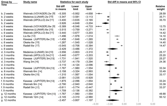 Figure 2 illustrates the SMDs of IOP between the post-treatment time points and baseline. All studies reported a significant reduction in IOP at every time point after LBN treatment. Subgroup analysis according to each time point revealed a significant pooled IOP reduction with LBN from 2 weeks to 12 months (SMD was −3.926 at 2 weeks, −2.429 at 6 weeks, −3.110 at 3 months, −2.081 at 6 months, −1.759 at 9 months, and −2.457 at 12 months).
