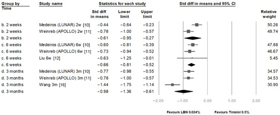 Figure 3 compares the IOP-reducing effect between LBN 0.024% and timolol maleate 0.5% at 2 weeks, 6 weeks, and 3 months. At these three time points, LBN significantly reduced IOP more than timolol. The SMDs were −0.61 (95% confidence interval (CI): −0.95 to −0.27), −0.66 (95% CI: −0.81 to −0.52), and −0.98 (95% CI: −1.36 to −0.61), respectively.