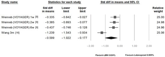 Comprehensive Meta-Analysis software, version 3 (Biostat, Englewood, NJ, USA) was used for the statistical analysis. The mean IOP reduction in the LBN at each post-treatment time point was calculated. For studies in which the LBN group was compared to timolol maleate 0.5% or latanoprost 0.005%, the differences in the IOP-lowering effect between groups were computed. Then, the standardized mean difference (SMD) of each study was derived by dividing the mean difference by the standard deviation to ensure that the difference was on the same scale. Then, the SMDs of the included studies were pooled to derive the overall differences at each time point. Forest plots were used to illustrate the point estimates of SMDs with a 95% confidence interval (CI). Moreover, the I2 statistic was used to assess heterogeneity across each trial. The I2 statistic reveals the percentage of variation between studies that is due to heterogeneity rather than chance or sampling error. An outcome of over 75% indicates considerable heterogeneity. Publication bias was determined using funnel plots and Egger’s test.