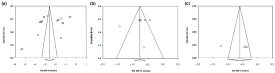 Funnel plots evaluating the publication biases regarding the IOP-lowering impacts of (a) LBN 0.024%; (b) the comparison between LBN 0.024% and timolol maleate 0.5%; and (c) the comparison between LBN 0.024% and latanoprost 0.005%. Circles represented studies.