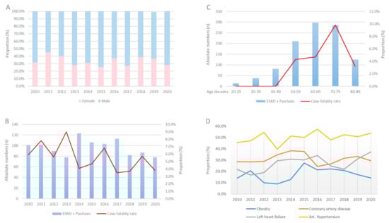 Proportion rate of gender distribution (A), absolute numbers, and case-fatality rate stratified across years (B) and decades (C) and proportion of comorbidities (D) in patients with ESRD and psoriasis between 2010 and 2020 in Germany.