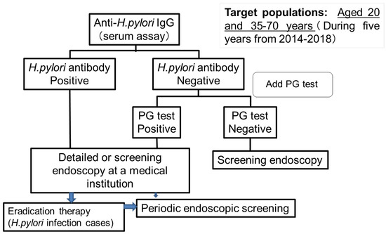 - Yashima, K.; Hasegawa, R.; Shabana, M.; Kawaguchi, G.; Isomoto, H. Mass screening considering Helicobacter pylori infection status for gastric cancer in Hoki-cho, Tottori prefecture. J. Gatsroenterol. Cancer Screen 2019, 57, 561–570. (In Japanese) [Google Scholar]