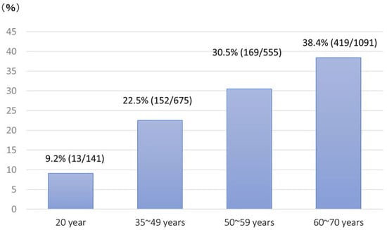 In cases with negative results for H. pylori diagnosis, we incorporated the serum PG method. During the 5 years from 2014 to 2018, there were a total of 6191 target individuals, of whom 2464 were screened (participation rate: 39.8%). The total number of H. pylori-positive cases was 753 (30.6%), and that of cases negative for H. pylori antibody and positive for the PG method was 58 (2.4%). The frequency of H. pylori positivity was 9.2% in individuals aged 20 years and <40% in individuals aged 60–70 years. This gradually increased with advancing age (Figure 2). The rate was highest (38.4%) among patients aged 60–70 years of age.