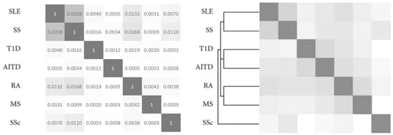 To validate our technique, we calculated the association values of seven AIDs. Figure 1 shows the AIDs association matrix of systemic lupus erythematosus (SSE), Sjögren’s syndrome (SS), type 1 diabetes (T1D), autoimmune thyroid disease (AITD), rheumatoid arthritis (RA), multiple sclerosis (MS), and systemic sclerosis (SSc). Figure 1 also shows the association matrix reported by Cifuentes et al. [3] Remarkably, the correlation between these two matrices is high (R = 0.91) and corroborates our predicted association of AIDs [3].