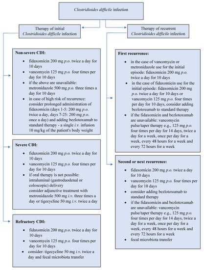 Fidaxomicin is a macrolide antibiotic with a narrow spectrum of activity against aerobic and anaerobic Gram-positive bacteria. After oral administration, it is not absorbed from the gastrointestinal tract. Its efficacy in CDI treatment is comparable to that of vancomycin—88% efficacy in patients treated with fidaxomicin compared to 86% in patients treated with vancomycin. Moreover, no adverse effect of fidaxomicin on the physiological intestinal microbiota was observed. Its advantage is a lower risk of relapse compared to patients treated with vancomycin (15% vs. 25%) due to the prevention of the formation of spores of Clostridioides difficile [,]. Different treatment algorithms are recommended, depending on the severity of CDI or the incidence of relapse, as presented in Figure 1.