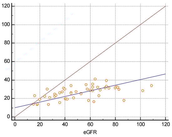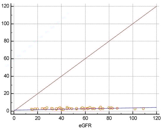 Scatter diagram between Median 2D SWE PLUS measures and eGFR.