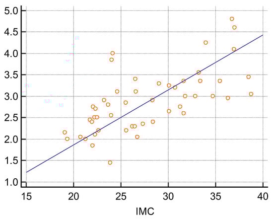 There were 16 women and 34 men among the 50 transplanted patients included in the study. They had a mean age of 47.5 years, a mean BMI of 27.8, and a mean eGFR of 52 mL/min/1.73 m2. Twenty received their new kidney from a living related person and 30 from a deceased donor. The mean time elapsed after transplant was 10.5 years. Thirty-seven out of them had a history of hypertension, 8 of diabetes, and 19 of previous glomerular disorders. The arithmetic mean of the median of the five measures using 2D SWE PLUS was 25.95 kPa, and the arithmetic mean of the median of the five measures using Vi PLUS was 2.82 Pa.s. We found a positive correlation coefficient between eGFR and the median measure of renal cortical stiffness (r = 0.5699, p < 0.0001), between eGFR and the median measure of viscosity (r = 0.3335, p = 0.0180) (Figure 2 and Figure 3), between the median depth of measures and renal cortical stiffness (r = −0.2795, p = 0.0493), and between median depth of measures and BMI (r = 0.6574, p < 0.0001) (Figure 4).