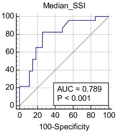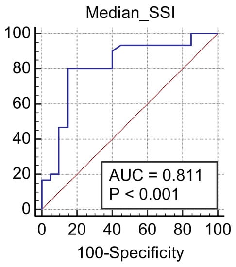 We obtained a cut-off value of renal cortical stiffness of <27.3 kPa for detection of eGFR < 60 mL/min/1.73 m2 with 80% sensitivity and 85% specificity (AUC = 0.811, p < 0.0001) (Figure 7), a cut-off value of <26.9 kPa for detection of eGFR < 45 mL/min/1.73 m2 with 82.6% sensitivity and 74% specificity (AUC = 0.789, p < 0.0001) (Figure 8), and a cut-off value of <23 kPa for detection of eGFR < 30 mL/min/1.73 m2 with 88.8% sensitivity and 75.6% specificity (AUC = 0.852, p < 0.0001) (Figure 9).