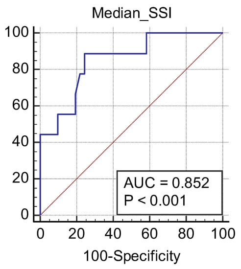 MedCalc Version 19.4 (MedCalc Software Corp., Brunswick, ME, USA) and Microsoft Office Excel 2019 were used for the statistical analysis (Microsoft for Windows). For demographic, anthropometric, and laboratory findings, descriptive statistics were employed. The distribution of numerical variables was determined using the Kolmogorov–Smirnov test. Numerical variables having a normal distribution are represented by means and standard deviation, whereas non-normal distribution variables are represented by median values and range. Percentages and figures were used to represent qualitative variables. The Pearson or Spearman correlation coefficient was used to express correlations between variables. A “p” value of <0.05 was considered to be statistically significant. Areas under receiver operating characteristic curves (AUC) were determined for 2D SWE PLUS to identify the optimal cut-off points that maximized the Youden index for staging CKD by eGFR. Positive predictive value (PPV—defined as the ratio of true positive cases to all positive cases), negative predictive value (NPV—defined as the ratio of true negative cases to all negative cases), and diagnostic accuracy (defined as the ratio of true positive and true negative cases to the total number of cases) were calculated. Univariate and multivariate statistical analyses were also implied.