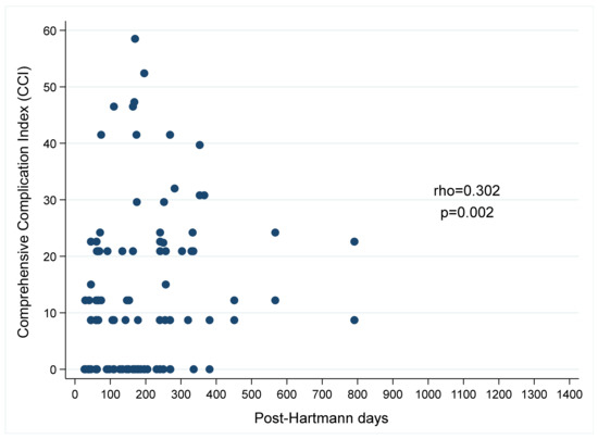 For the evaluation of short-term outcomes, a CCI of 12.2, which corresponds to 2 post-operative complications of CD grade I severity, was used as the threshold between high (CCI > 12.2) and low (CCI < 12.2) CCI. For the evaluation of long-term outcomes, based on IVH occurrence, the sample was stratified into two groups that were compared to each other. The statistical significance of the pair comparisons was evaluated with χ2 test or Fisher’s exact test for categorical variables, and with the Wilcoxon rank-sum (Mann–Whitney) test for continuous variables. The latter was also applied to assess the differences between the median values of post-Hartmann days in the absence/presence of leakage and intra-operative complications. Spearman’s correlation was used to evaluate the relationship between CCI and post-Hartmann days and the correlation was graphically represented by a scatter plot.