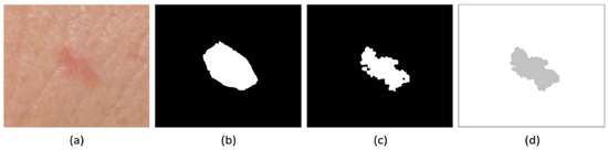 Example of original image (a), lesion mask provided as part of Dermofit dataset (b), recalculated lesion mask using k-means clustering (c), and obtained lesion boundary (d).