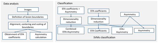 SVMs were trained on 70% of data, separating the remaining 30% for testing and model evaluation. SVMs were mostly trained on raw PC scores, filtering only those PC scores representing up to 95% sample variance. For this purpose, the first experiment trained SVMs on PC scores obtained from EFA coefficients (Figure 3), while the second experiment trained SVMs on PC scores calculated when asymmetry indices were also included. Nevertheless, two additional experiments were also performed (Figure 3): one calculating the degree of univariate separability on asymmetry indices alone, and a final experiment appending the PC scores obtained from EFA coefficients with the asymmetry indices, enabling an assessment of the effect asymmetry has on classification results prior to a combined dimensionality reduction (Figure 3).