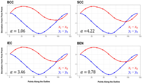 Upon analysing the projection and the morphological variations along the curvilinear abscissa (Figure 5), the oscilloscopes confirmed Benign samples to be the most elliptical lesions in nature (α = 0.78), with hardly any deviations from a theoretical ellipsoid (Figure 5). The SCC (α = 3.46) and IEC (α = 4.22) samples, on the other hand, appear to deviate the most along the outline, with frequent irregularities along the lesion borders. Interestingly, the BCC samples present a relatively smooth curve, where the malignant samples are of the greatest spherical nature (α = 1.06).