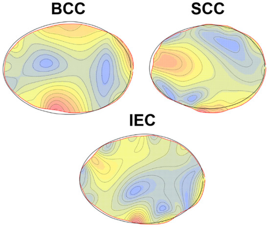 When analysing the differences between each of the malign lesions in comparison with the benign samples, the Thin Plate Splines (TPS) and isoline plots confirm these deformations (Figure 6), with samples such as SCC and IEC presenting distinct lateral constrictions. The BCC samples, on the other hand, are characterised by a more irregular-oval shape. Overall, the isoline heatmaps reveal all the malignant samples to present highly localised deformations, which would indicate shape variation to be a product of edge irregularities, as opposed to an overall change across the entire elliptical nature of the lesion. From this perspective, it could be assumed that lesion asymmetry is a powerful conditioning factor in diagnoses of malignant and benign lesions.