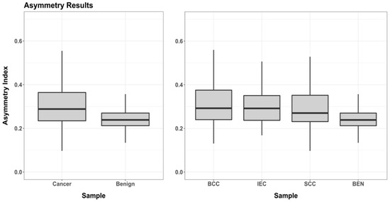Upon calculating the asymmetry indices for each of the samples, great differences emerged between the benign lesions and each of the carcinoma samples (Table 2, Figure 7). In most of the cases, the malignant lesions present much higher variability (Interquantile Range = 0.37, √BWMV = 0.093) as opposed to benign lesions (Interquantile Range = 0.19, √BWMV = 0.046). The differences between these samples are also of great importance (χ2 = 103.3, p = 2.2 × 10−16, FPR = 2.2 × 10−12 +/− [5.4 × 10−13, 8.6 × 10−12]%). When considering each malignant sample separately, boxplots indicate that BCC is the sample with the greatest degree of asymmetry (Figure 7); nevertheless, robust metrics (Table 2) reveal the IEC and BCC to have the same central index, with IEC presenting the largest robust interquartile range (BCC = 0.375, SCC = 0.400, IEC = 0.435).
