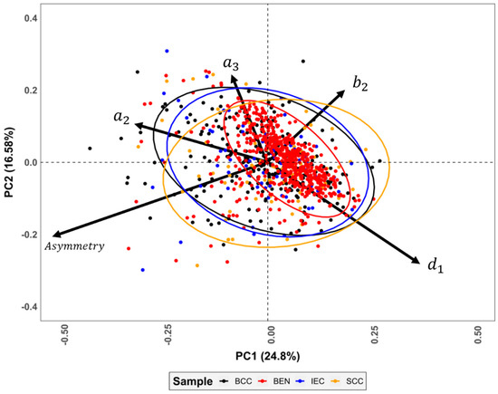 Through an in-depth analysis of the PCA scatter plots, it was observed that the asymmetry index produces a notable irregular dispersion among the malignant samples (skewness = −3.0, kurtosis = 12.0), pushing the benign lesions into a much more concentrated distribution (skewness = −3.9, kurtosis = 33.8), which is better described by the original elliptic Fourier coefficients.